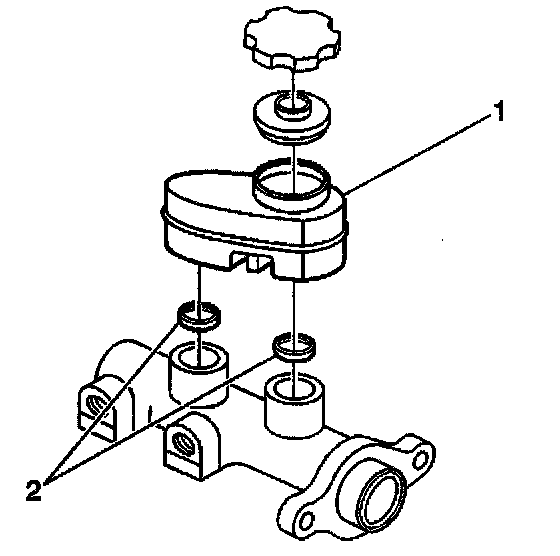 4. Lubricate the new seals (2) and the outer surface area of the reservoir-to-housing barrels with Delco Supreme II (R), GM P/N 12377967 (Canadian P/N 992667) or equivalent DOT-3 brake fluid from a clean, sealed brake fluid container.