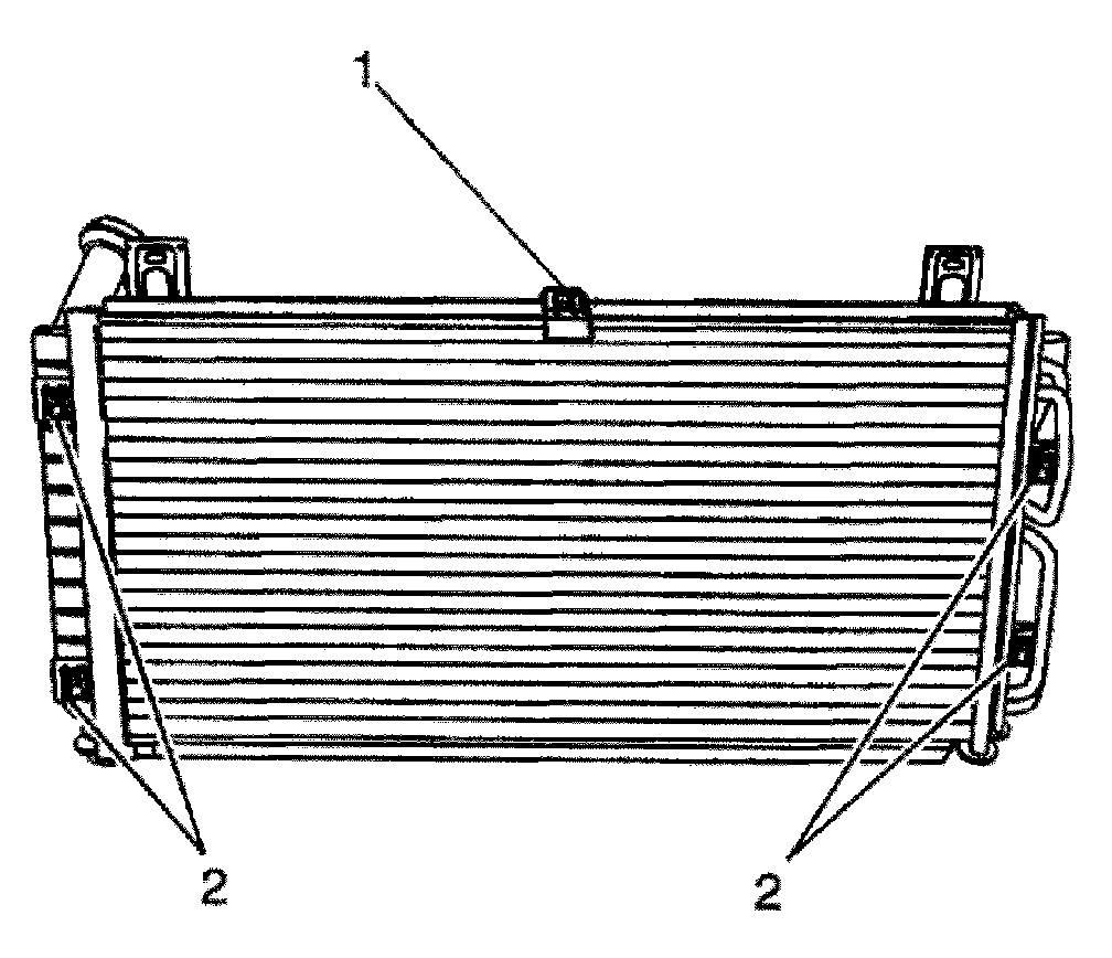 22. Lift the condenser from the mounting tabs on the radiator (2). Position the condenser aside.