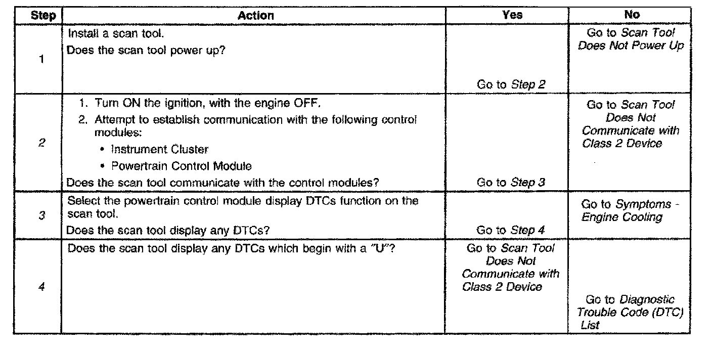 2. Lack of communication may be due to a partial malfunction of the class 2 serial data circuit or due to a total malfunction of the class 2 serial data circuit. The specified procedure will determine the particular condition.