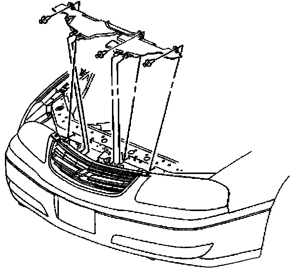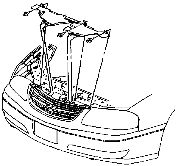 9. Position the radiator air baffle to the vehicle. Tilt the rear of the air baffle upward slightly. Position the upper clip of the air baffle to the lower edge of the front fascia support C-channel.