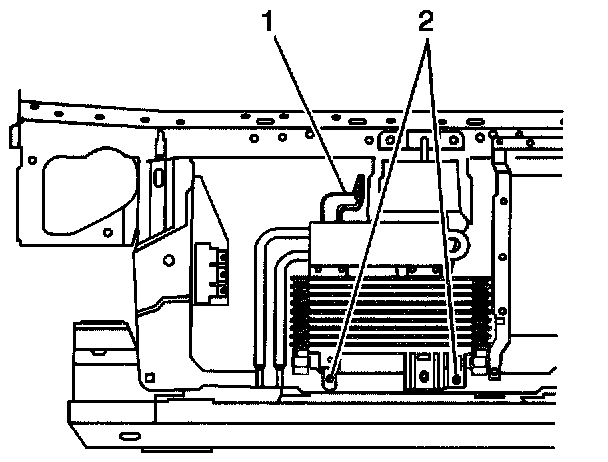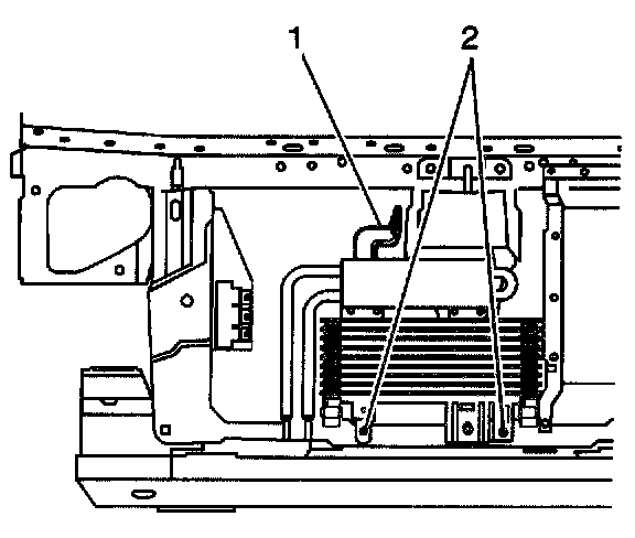 10. Remove the lower bolts (2) from the engine oil cooler/power steering cooler.