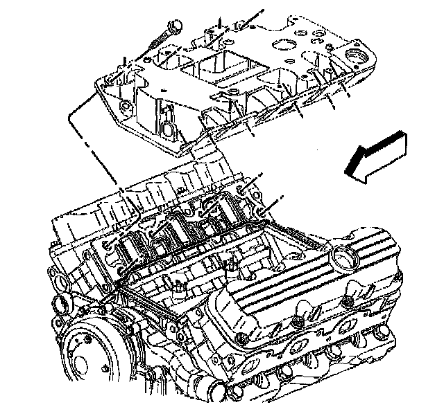 Intake Manifold Removal - LowerImportant: Bolts which fasten the lower intake manifold to the cylinder head are accessible only after the upper intake is removed. The bolts are located in the right front and left rear corners of the lower intake manifold. Remove the upper intake manifold to service the lower intake.