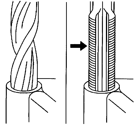 Important: Refer to the thread repair kit manufacturer's instructions regarding the size of the drill and which tap to use. Always avoid any buildup of chips. Back out the tap every few turns and remove the chips.