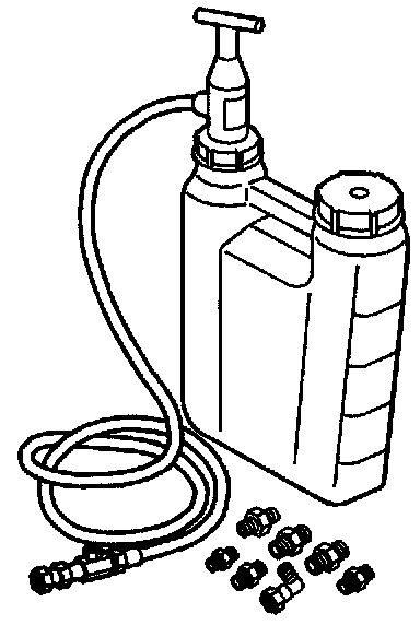 6. Frump the handle on J 45299 to flow a minimum of 1-2 quarts of engine oil. Observe the flow of engine oil through the flexible hose and into the engine assembly.