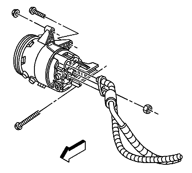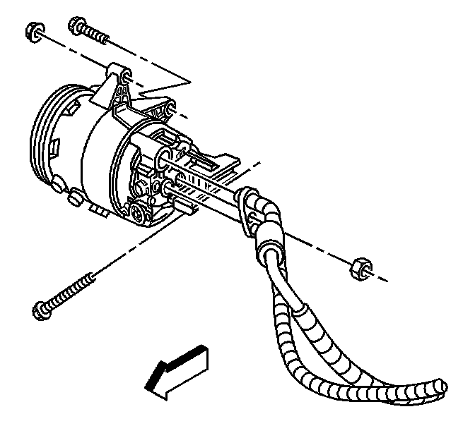 2. Position the A/C compressor on to the rear A/C compressor mounting bolt and front A/C compressor stud.