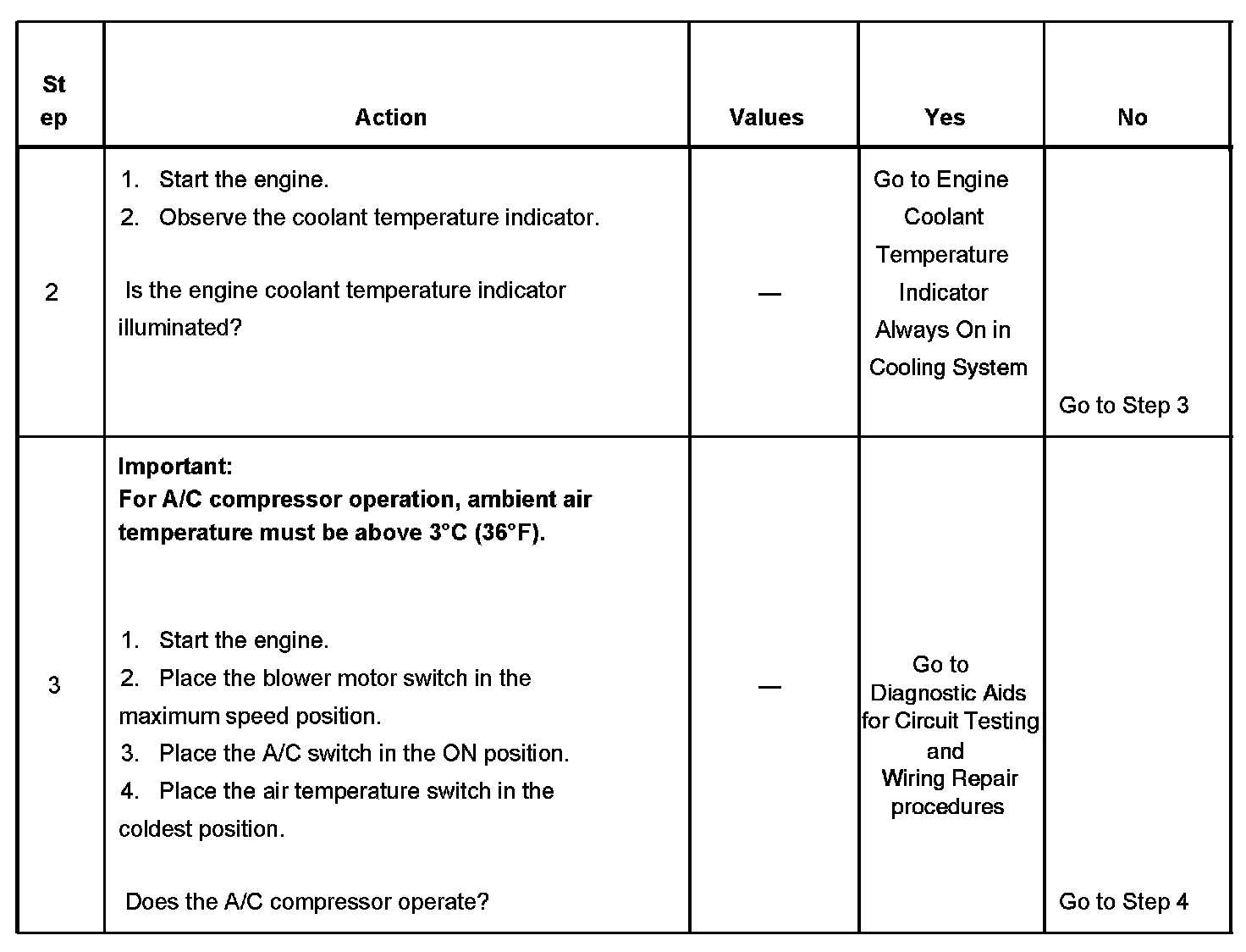2. The A/C compressor relay output is disabled if engine coolant temperature is above 121°C (250°F). The engine coolant indicator will illuminate at this temperature.