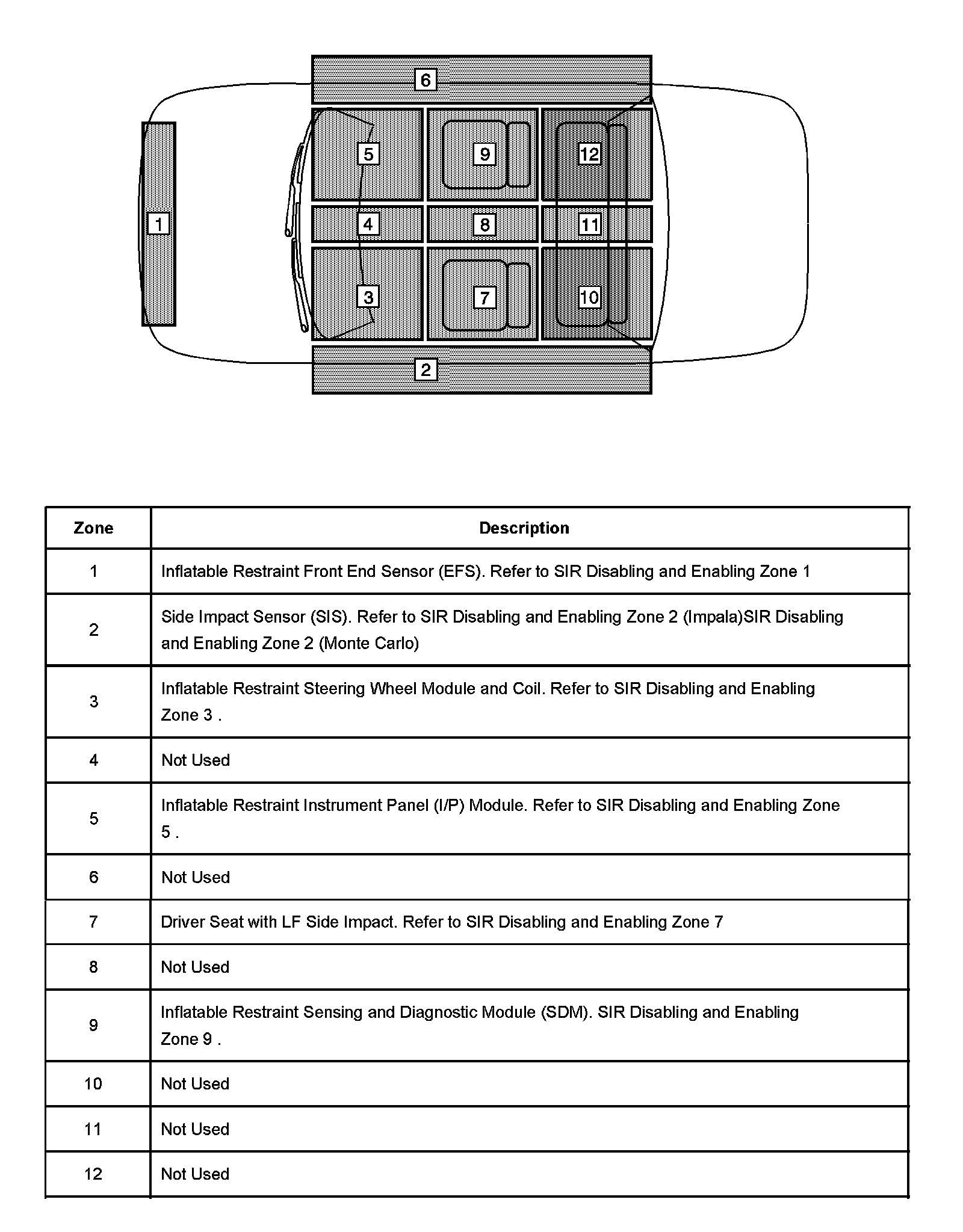 The SIR system has been divided into Disabling and Enabling Zones. When performing service on or near SIR components or SIR wiring, it may be necessary to disable the SIR components in that zone. It may be necessary to disable more than one zone depending on the location of other SIR components and the area being serviced, refer to SIR Zone Identification Views. Refer to the illustration below, to identify the specific zone or zones in which service will be performed. After identifying the zone or zones, proceed to the disabling and enabling procedures for that particular zone or zones.