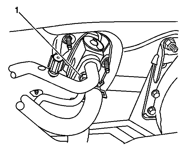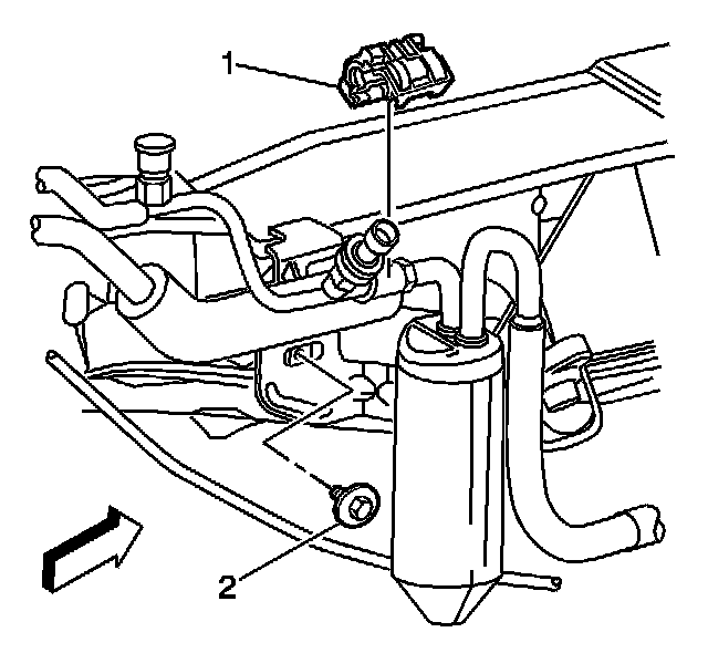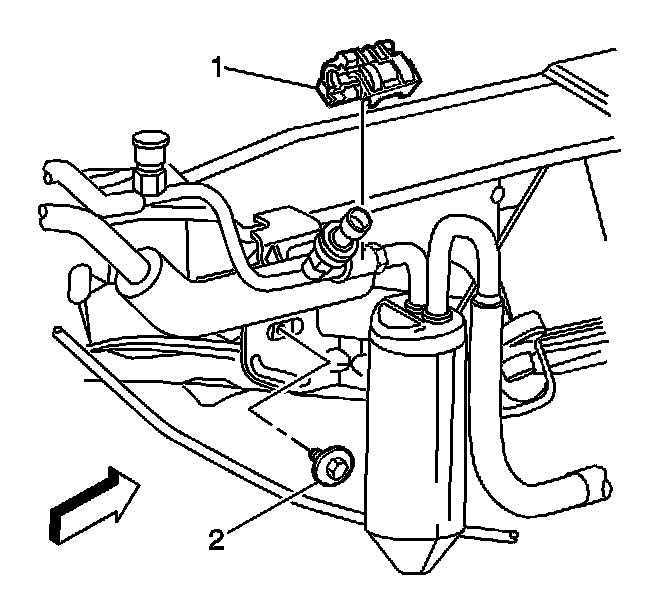 10. Remove the A/C line coupling from the evaporator tube to receiver dehydrator tube (1).