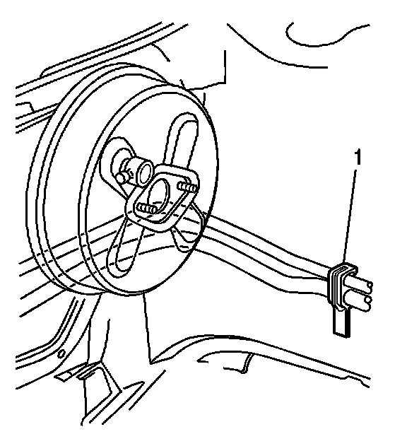 19. Remove the evaporator tube from the support clip (1) on the left fender rail.