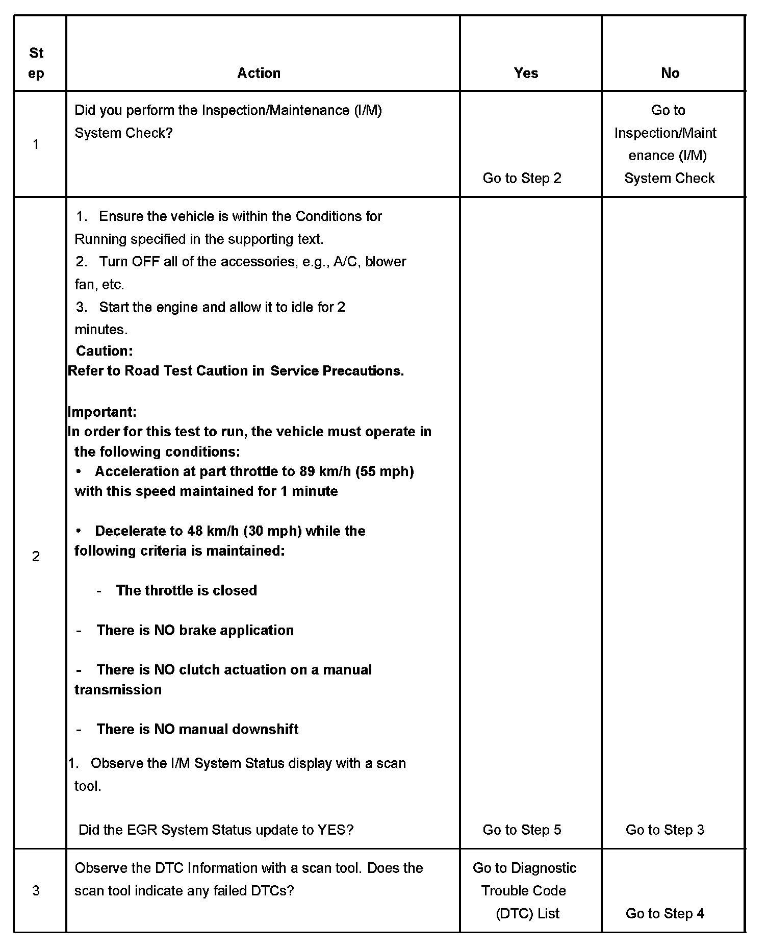 The purpose of this test is to satisfy the enable criteria necessary to execute inspection/maintenance (I/M) readiness diagnostics for the exhaust gas recirculation (EGR) system. The test may be used to set the I/M System Status indicators to YES. The I/M System Status display on the scan tool provides an indication of whether the control module has completed the required tests. The I/M System Status does not indicate that the tests have passed or failed. When all of the diagnostics for a specific system have run and passed, the I/M System Status will update to YES. If a test for a specific system has failed, the I/M System Status will update to YES, indicating a determination was made even if all of the other tests for that system have not run.