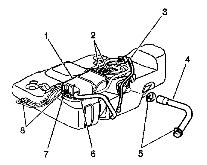 2. Disconnect the evaporative emission (EVAP) vapor pipe (7) from the EVAP canister (1), the fill limiter vent valve, and the fuel sender assembly.