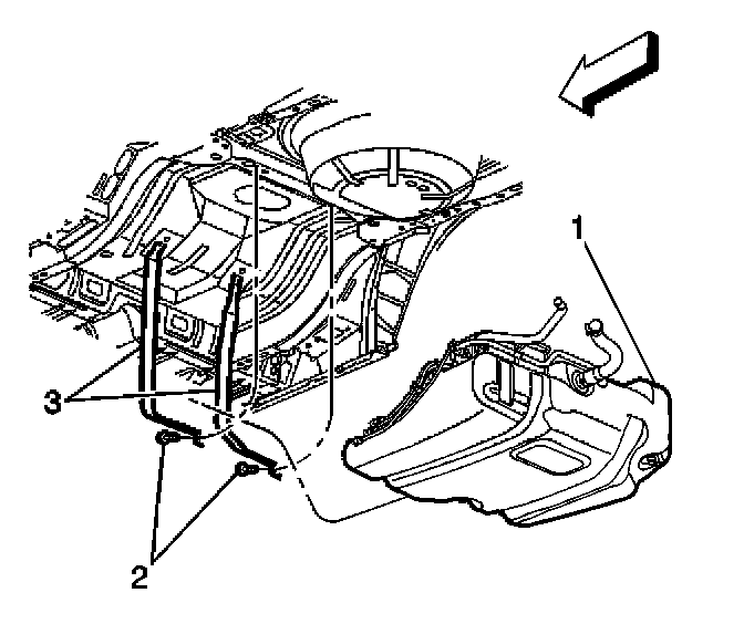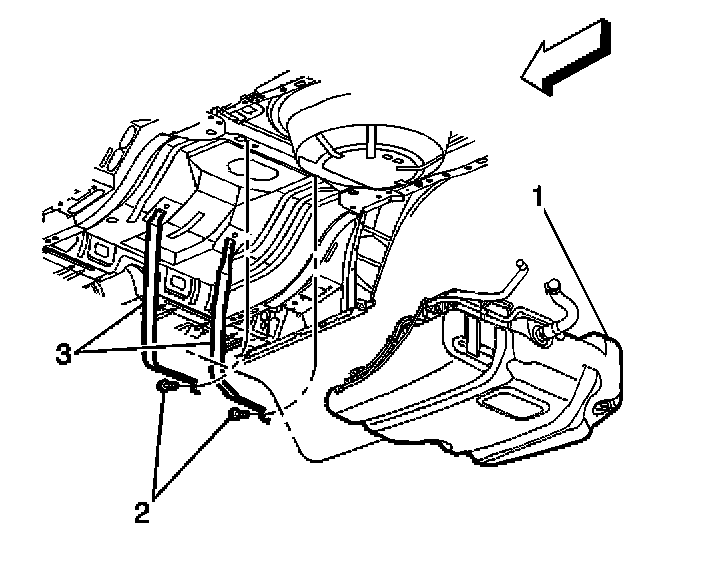 13. Remove the fuel tank strap bolts (2) from the fuel tank straps (3).
