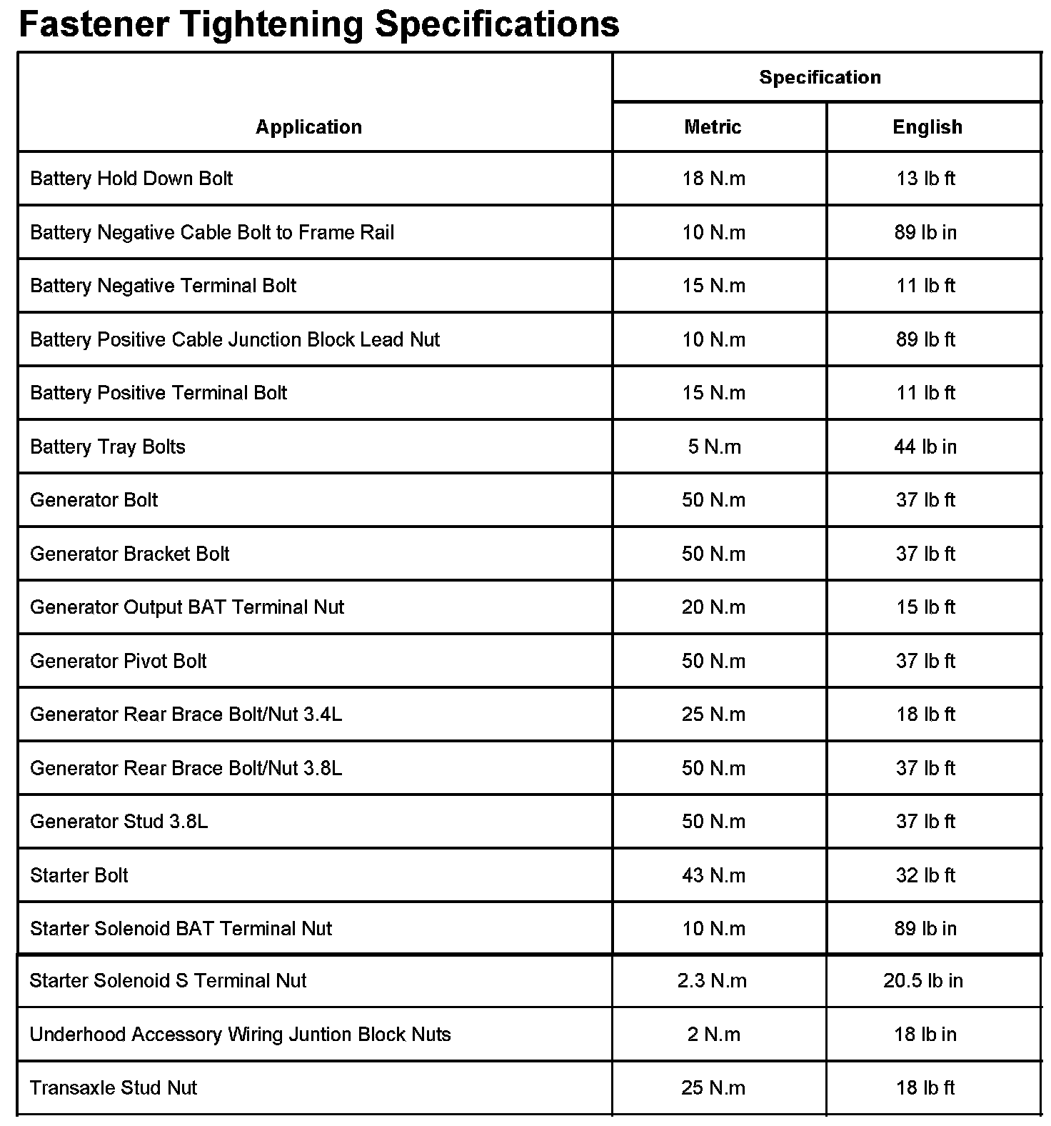 Fastener Tightening Specifications: