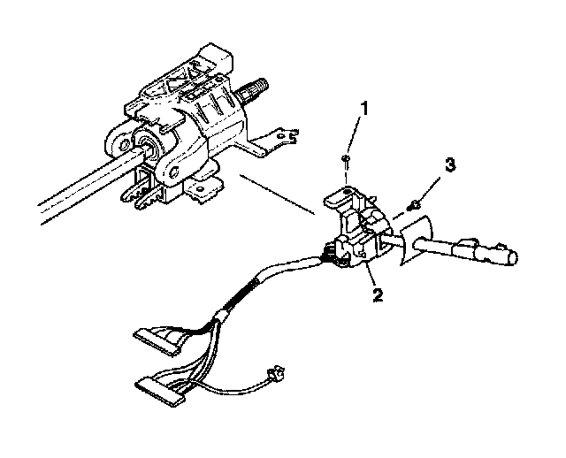 6. Remove the 2 pan head tapping screws (1) and (3) from the turn signal and multifunction switch assembly (2).