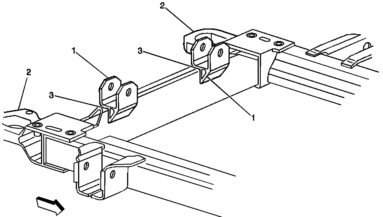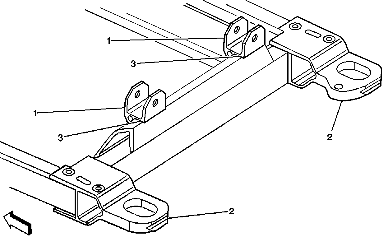 On the top surface of the frame rear crossmember at location (3), pool approximately 1/4 ml of threadlocker material on each side of both the steering gear brackets (1).