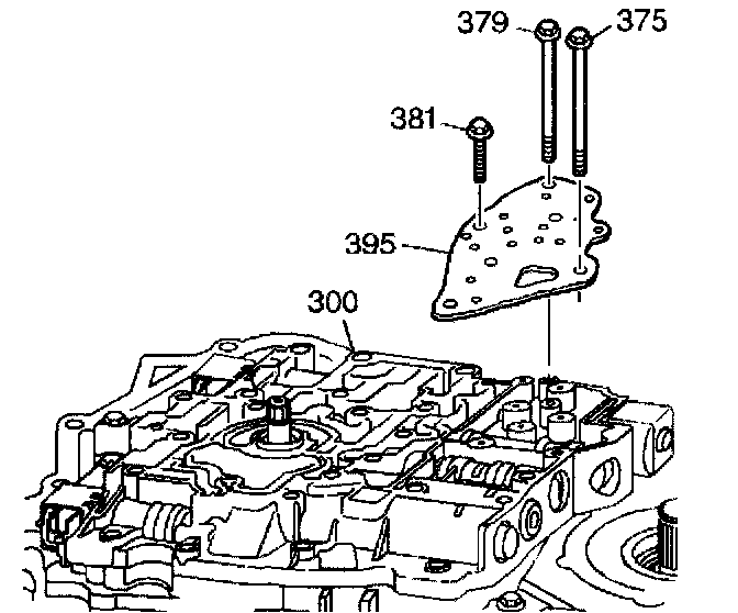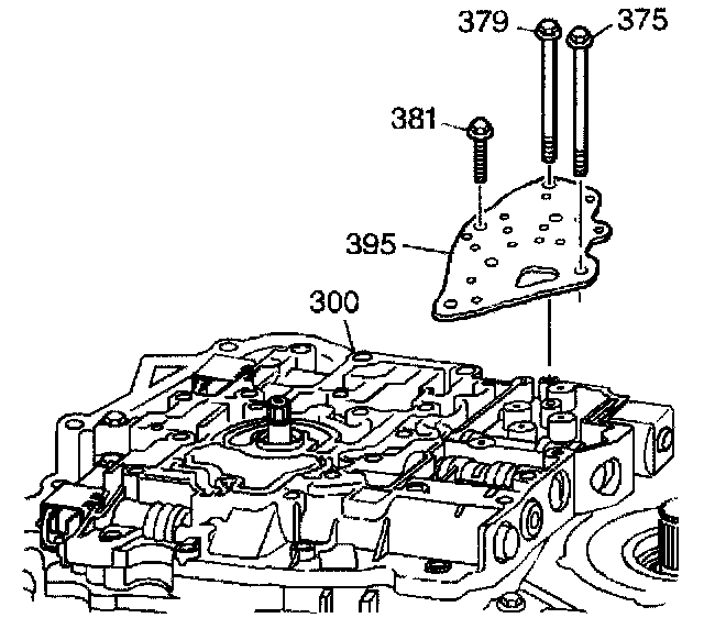 2. Install the control valve body bolts (375, 379, 381) that mount the TFP switch to the control valve body (300).