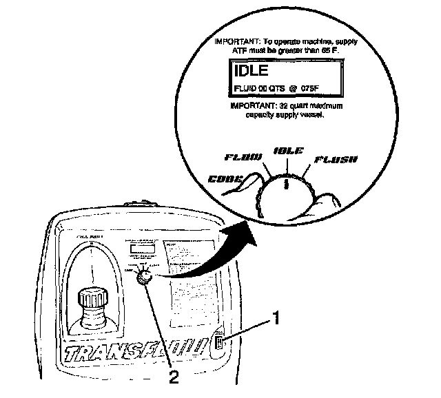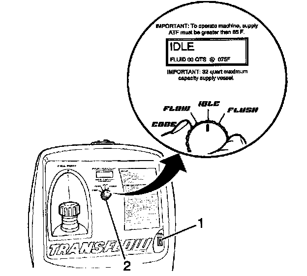 2. Connect the black supply hose (1) to the return line, top connector of the transmission, and the clear waste hose (2) to the feed line, bottom connector of the transmission, to the vehicle cooler lines. This is the reverse flow - backflush direction.
