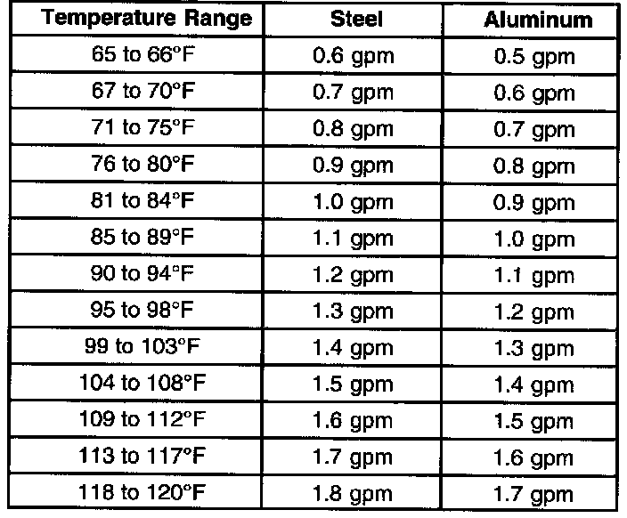 3. Refer to the table. Using the temperature from step 1, locate on either the Steel MINIMUM Flow Rate table or the Aluminum MINIMUM Flow Rate table the minimum flow rate in Gallons Per Minutes (GPM). Record the minimum flow rate in GPMs and the supply fluid temperature for further reference.