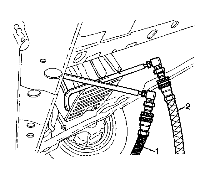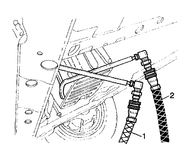 1. Connect the J45096 adapters (1) to the vehicle's transmission oil cooler supply and return lines at the transmission.