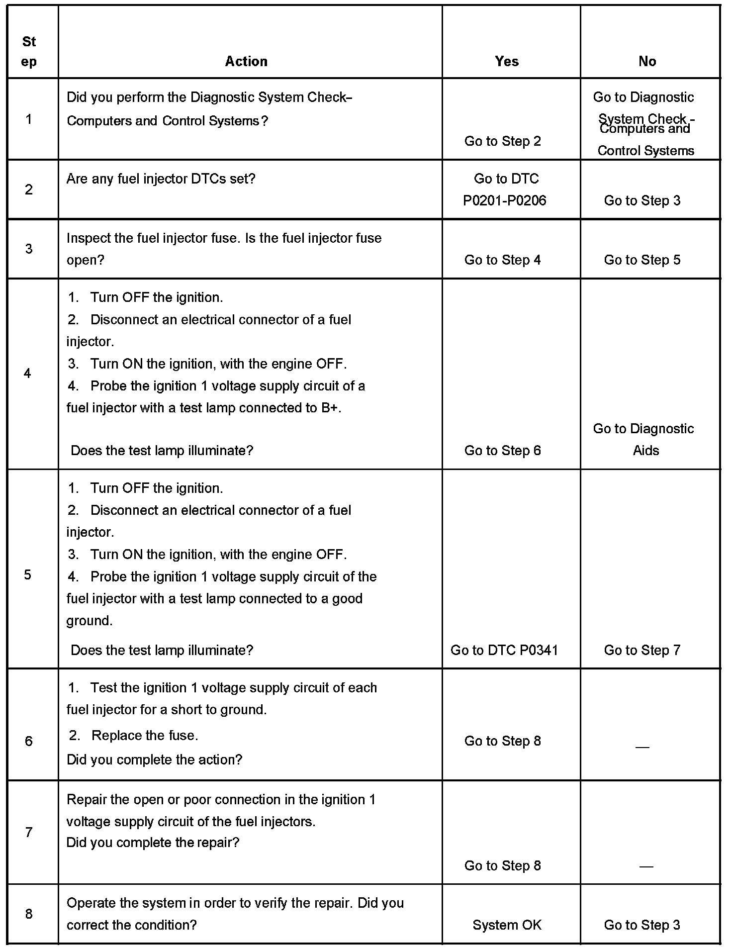 5. This step tests for an open ignition 1 voltage supply circuit between the injector fuse and a fuel injector electrical connector.