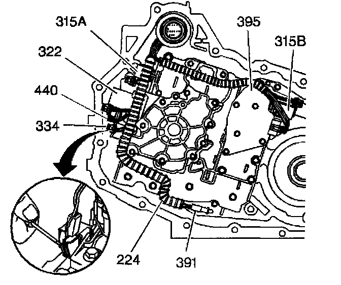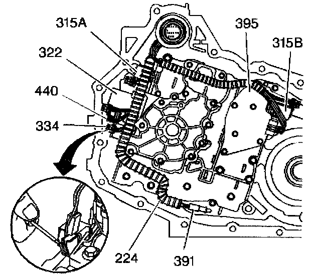 2. Use a small flat-bladed tool in order to remove the wiring harness from the solenoid valve (315A, 315B, 322, 334 and/or 440), TFP manual valve position switch (395) and the temperature sensor (391).