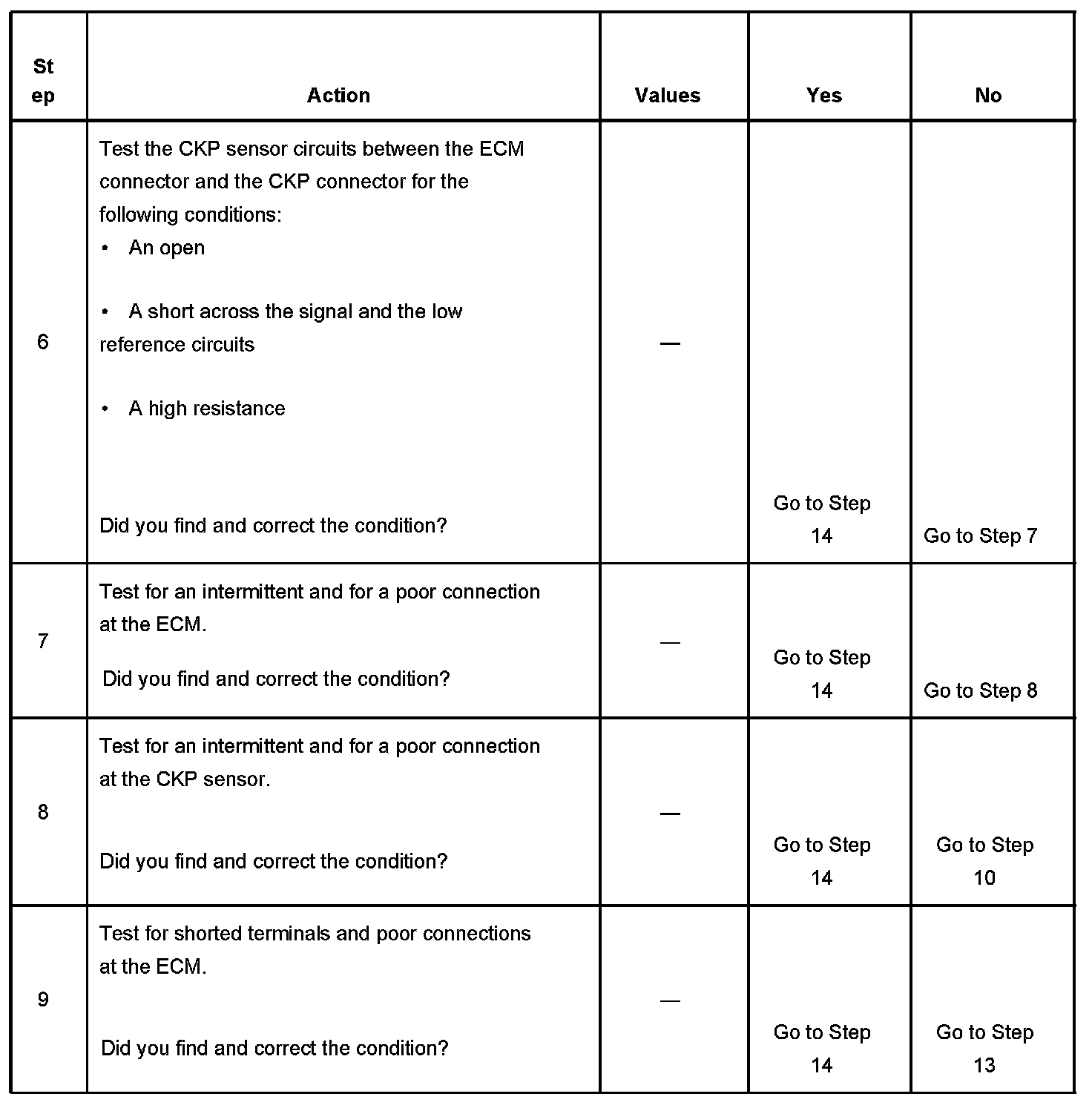 The ECM detects no CKP pulses during engine cranking for 8 seconds.