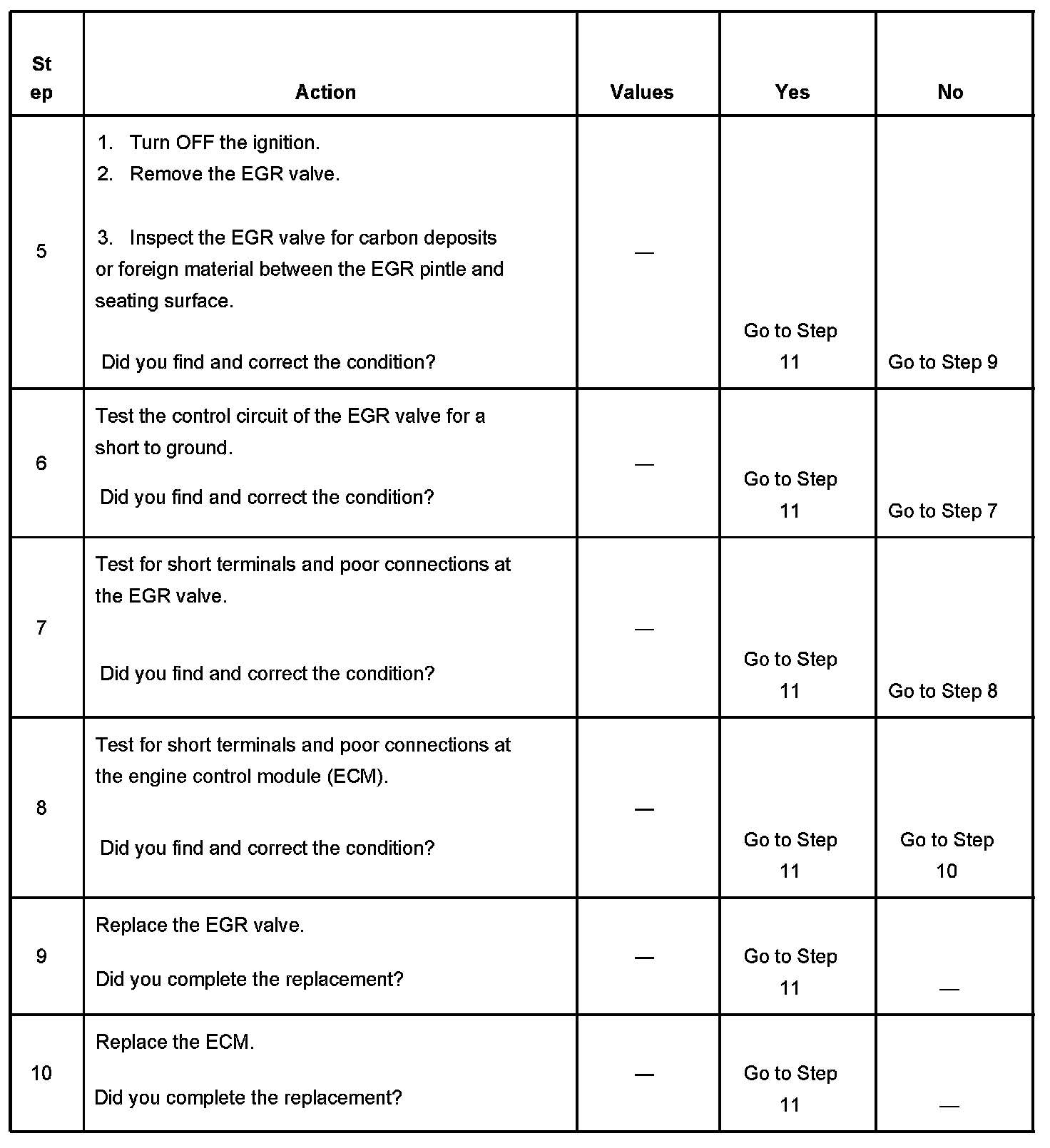 The ECM detects excessive EGR flow due to the EGR valve pintle being open more than 70 percent for 3 seconds during crank.