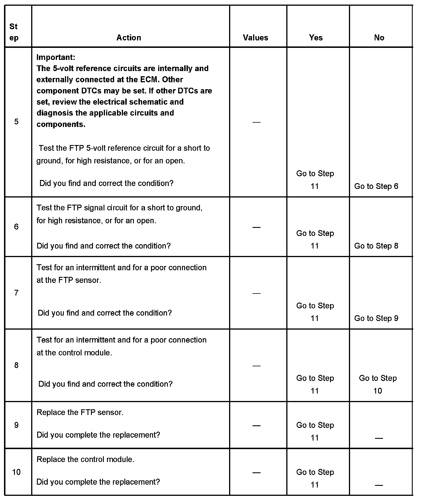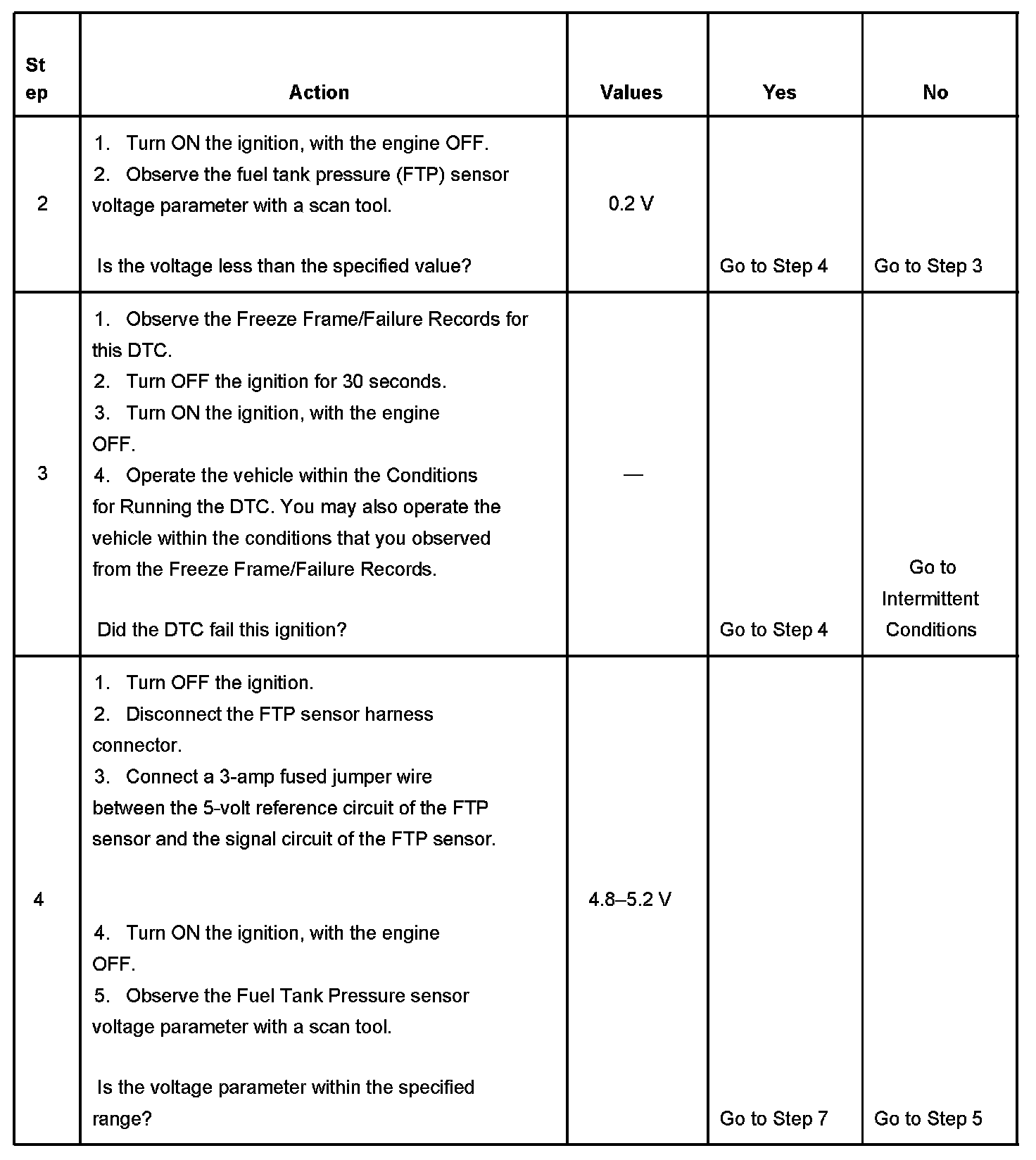 The evaporative emission (EVAP) system is used to store fuel vapors in order to reduce the amount of fuel vapors into the atmosphere. The fuel tank pressure (FTP) sensor is only used for EVAP system diagnostics. The FTP sensor is a transducer that varies resistance according to changes in the fuel tank pressure. The engine control module (ECM) monitors the FTP sensor signal in order to detect vacuum decay and excess vacuum during the EVAP system diagnostic test. The ECM supplies a 5 volt reference and a low reference circuit to the FTP sensor. If the ECM detects that the FTP sensor signal voltage is too low, this DTC sets.
