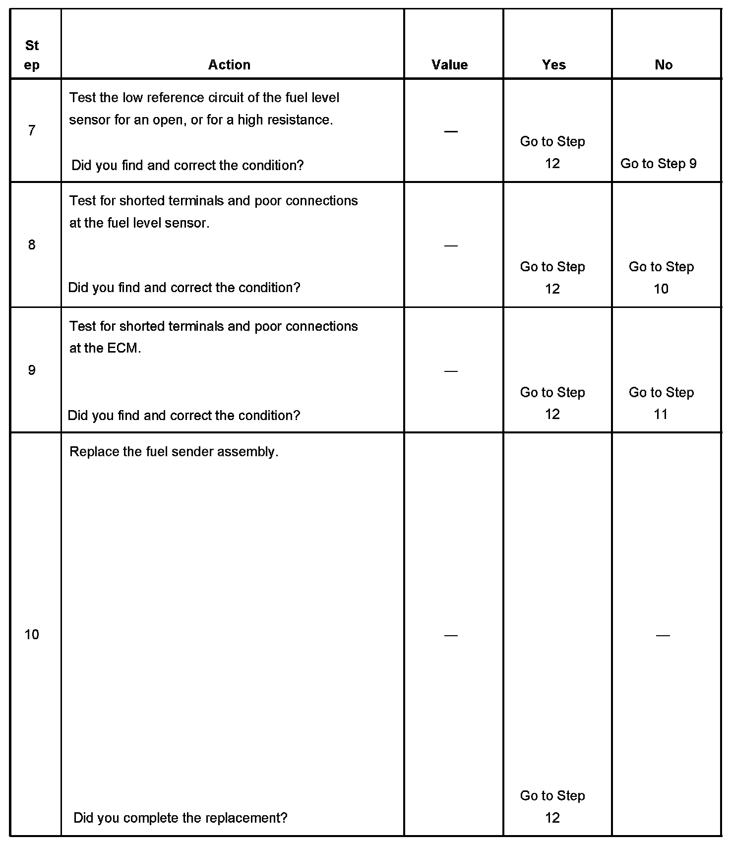 When the fuel tank is full, the sensor resistance is low, and the ECM signal voltage is high. When the fuel tank is empty, the sensor resistance is high, and the signal voltage is low.