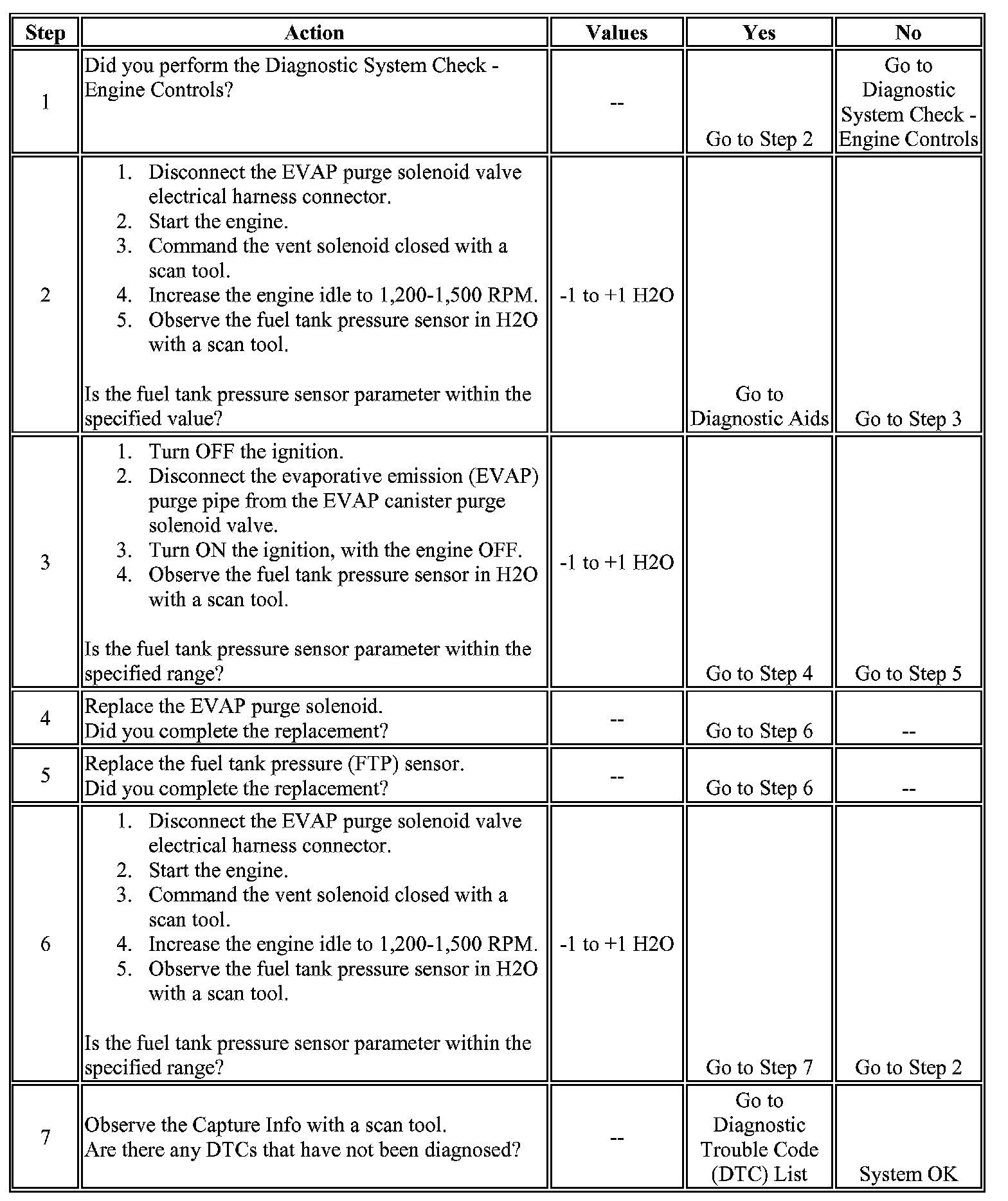 This DTC tests for continuous intake manifold vacuum flow to the Evaporative Emission (EVAP) System. The control module seals the EVAP system by commanding the EVAP canister purge solenoid valve Closed and the EVAP canister vent solenoid valve Closed. The control module monitors the fuel tank pressure (FTP) sensor to determine if a vacuum is being drawn on the EVAP system. If vacuum in the EVAP system is more than a predetermined value within a predetermined time, this DTC sets.