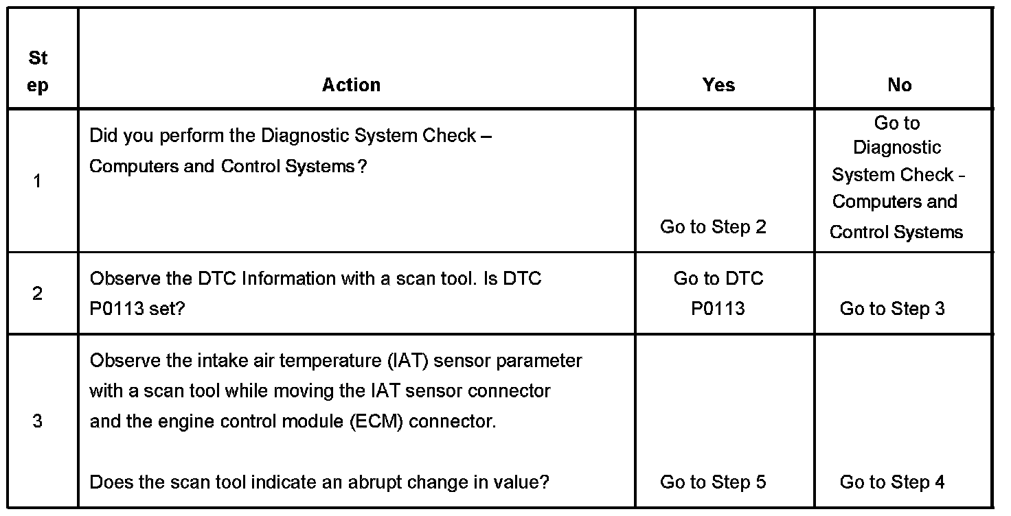 The intake air temperature (IAT) sensor is a variable resistor that measures the temperature of the air entering the engine. The IAT sensor has a signal circuit and a low reference circuit. The engine control module (ECM) supplies 5 voltsto the IAT signal circuit and a ground for the IAT low reference circuit. If the ECM detects an intermittent high IAT signal voltage, which is a low temperature indication, this DTC sets.