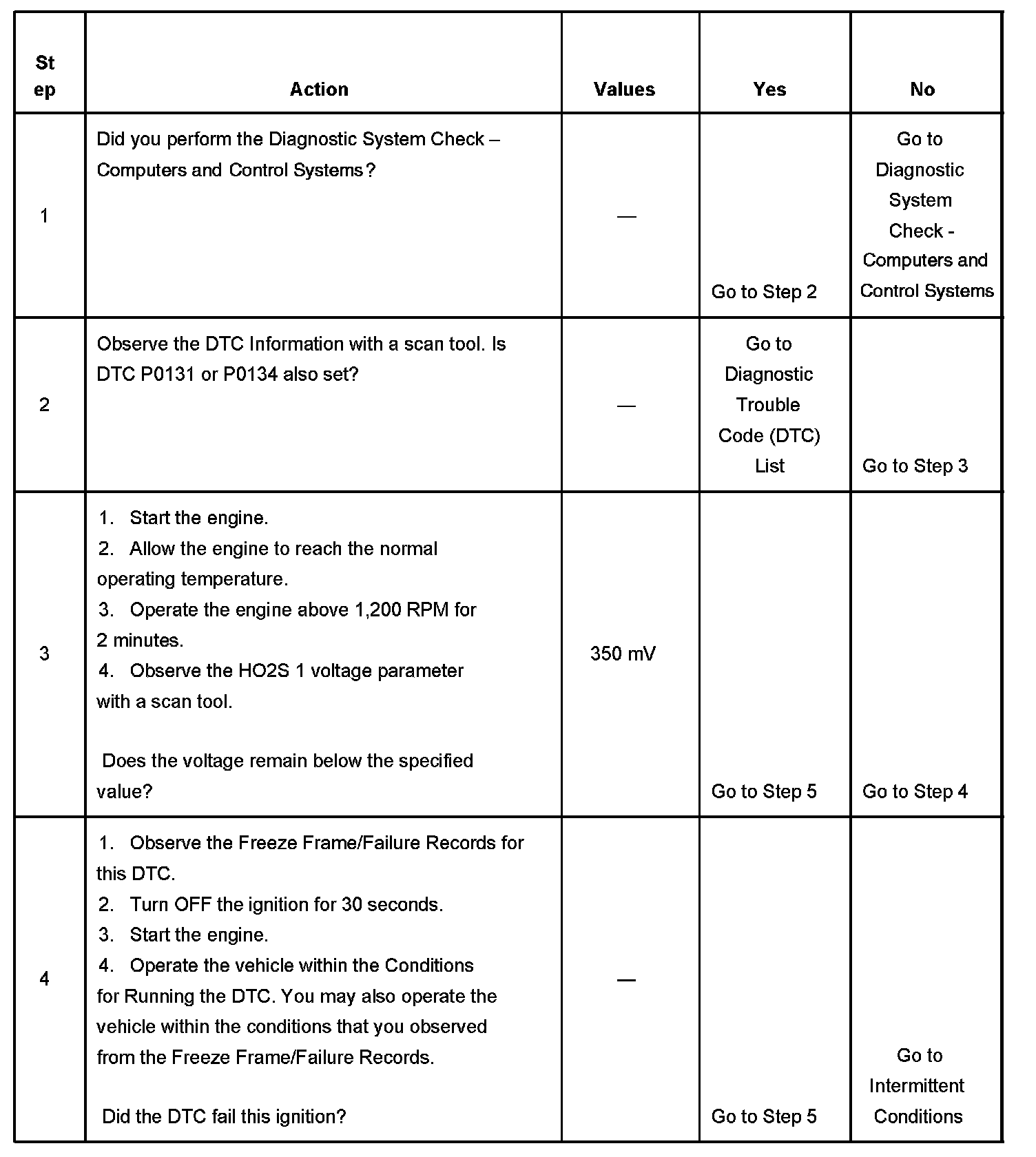If the ECM detects the HO2S 1 voltage signal is too low during Power Enrichment (PE) mode, this DTC sets.