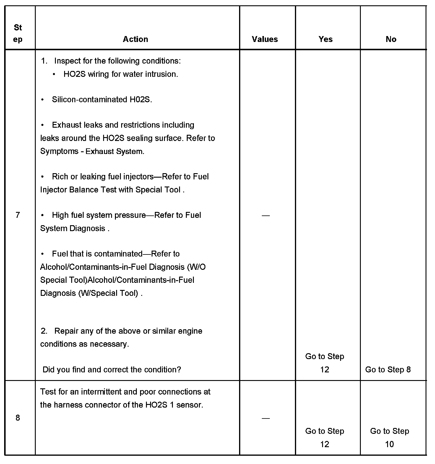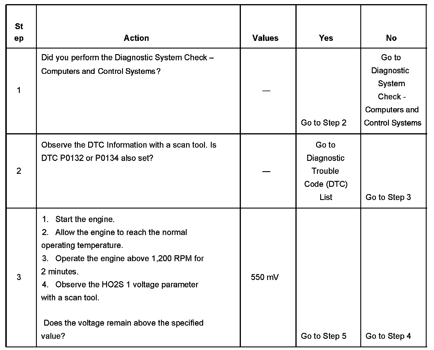 The ECM detects that the HO2S 1 voltage is more than 550 mV for 11 seconds during Decel Fuel Cut-Off (DFCO) mode.