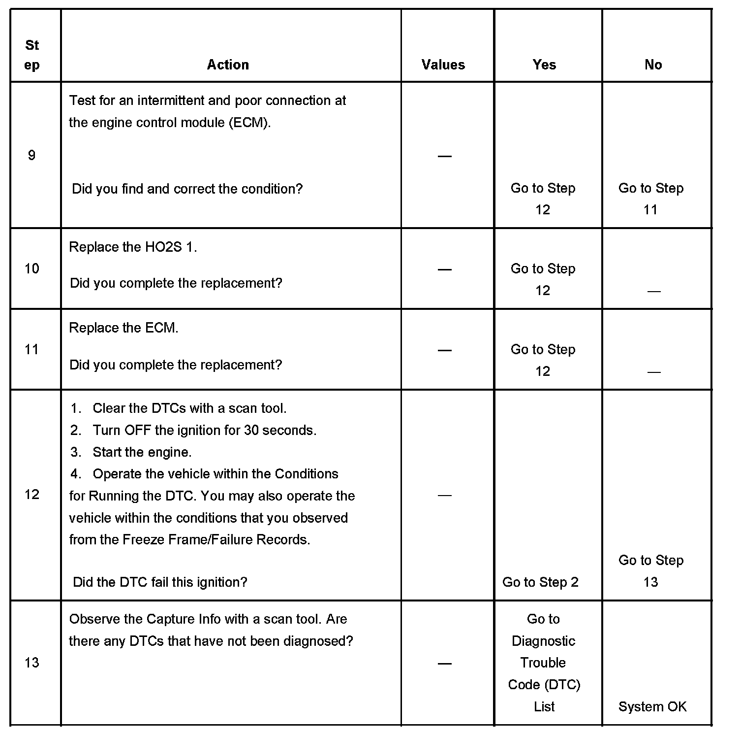 If the ECM detects the HO2S 1 voltage signal is too high during Decel Fuel Cut-Off (DFCO) mode, this DTC sets.