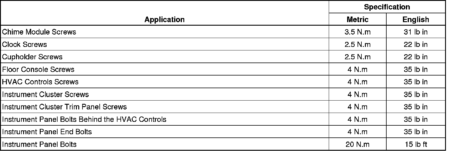 Instrument Panel, Gages and Console - Fastener Tightening Specifications