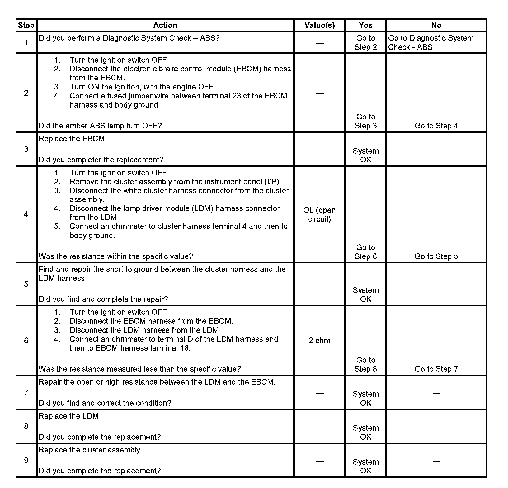 When the EBCM commands the ABS lamp OFF, the EBCM will ground the ABS warning lamp control circuit. This causes the lamp driver module to open the path to ground for the bulb.