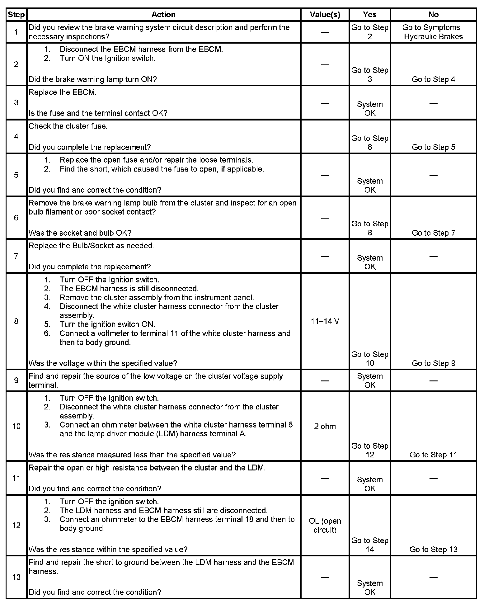 When the EBCM commands the brake warning lamp OFF, the EBCM will ground the brake warning lamp control circuit. This causes the lamp driver module to open the path to ground for the bulb.