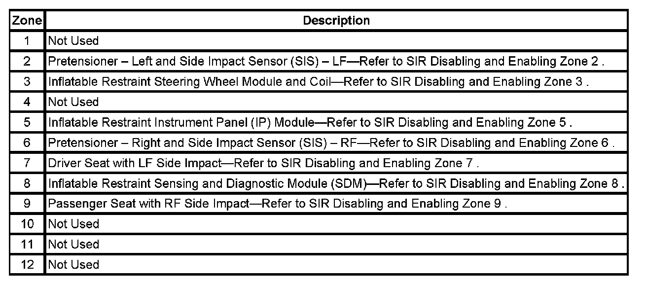 - The SIR system has been divided into Disabling and Enabling Zones. When performing service on or near SIR components or SIR wiring, it may be necessary to disable the SIR components in that zone. It may be necessary to disable more than one zone depending on the location of other SIR components and the area being serviced, refer to SIR Component Views. Refer to the illustration, to identify the specific zone or zones in which service will be performed. After identifying the zone or zones, proceed to the disabling and enabling procedures for that particular zone or zones.