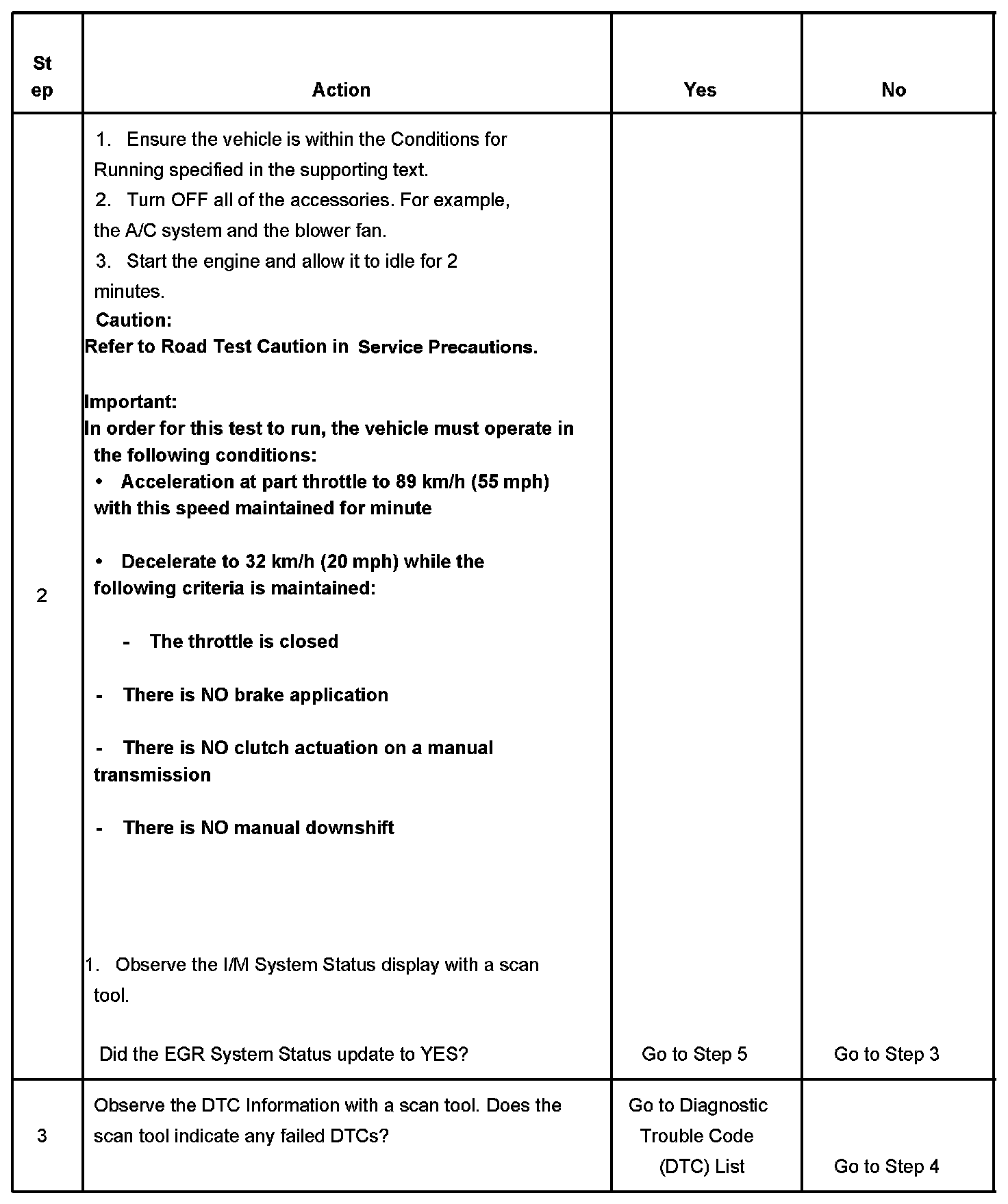 The control module only runs the EGR Active Tests during a gradual deceleration with a closed throttle and a vehicle speed above 32 km/h (20 mph). Several deceleration cycles may be necessary in order to accumulate a sufficient number of EGR flow samples. The procedure outlined in the table is for a clear, flat road. If the procedure is performed on a road with a slight down hill grade, the test may acquire the necessary sample counters in one or two decel trips. If the test is interrupted during the procedure, it may take more than three deceleration cycles to complete the test. If the status does not update, the test outlined in this procedure can be repeated until the I/M System Status updates to YES.