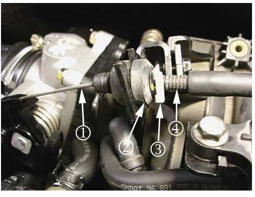 1. Remove retaining clip (3) from throttle body cable and pull cable casing (4) away from throttle body to remove any excess play in the accelerator cable.