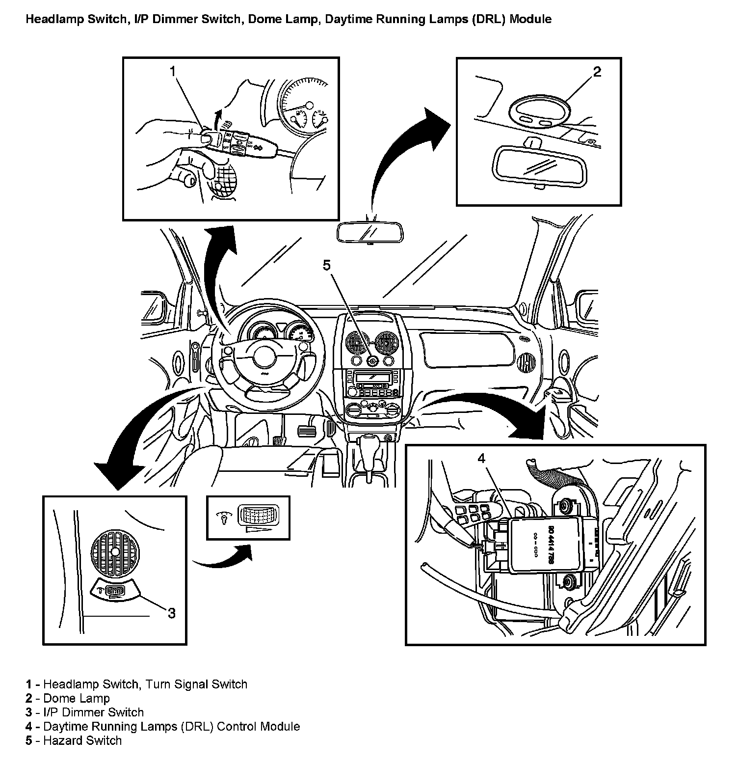 Headlamp Switch, I/P Dimmer Switch, Dome Lamp, Daytime Running Lamps (DRL) Module: