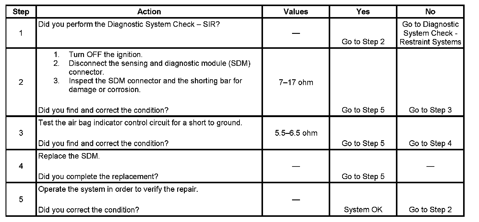 In order to disable the shorting bar between the air bag indicator control circuit and ground inside the SDM wiring harness connector, the following 2 conditions must be met: