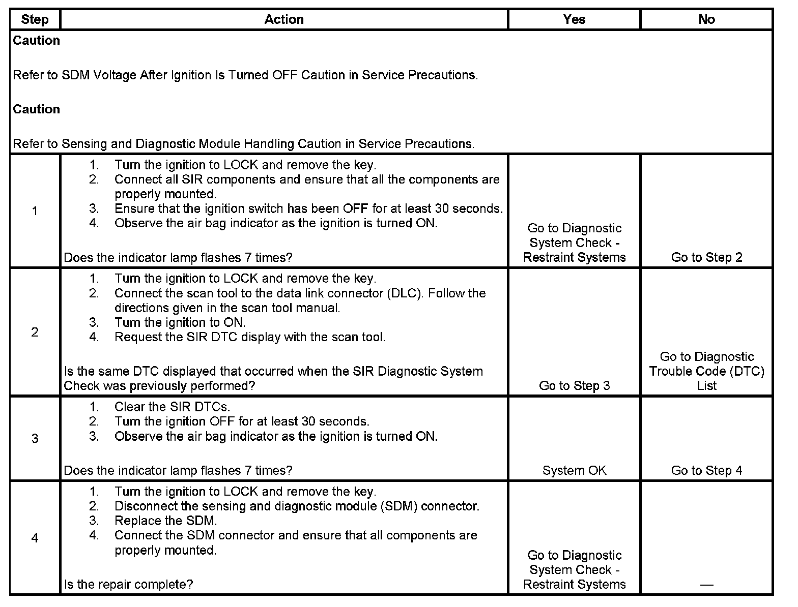 The following diagnostic chart must be used when all circuitry outside the sensing and diagnostic module (SDM) has been found to operate properly, as indicated by following the appropriate diagnostic trouble code (DTC) chart. The chart verifies the need for SDM replacement.