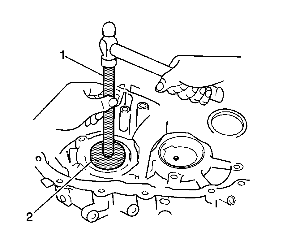 1. Using the DT 46462 (2) and the DT 46465 (1), install a new side bearing outer race into the transaxle housing.