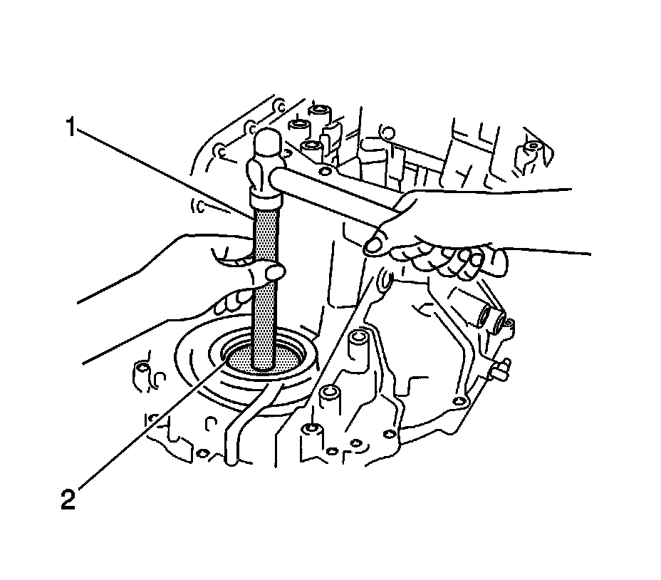 12. Using the DT 46463 (2) and the DT 46465 (1), remove the transaxle case side bearing outer race and shim.