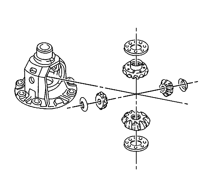 8. Remove the 2 differential pinion gears, 2 differential side gears, 2 differential pinion thrust washers, and 2 differential side gear thrust washers.