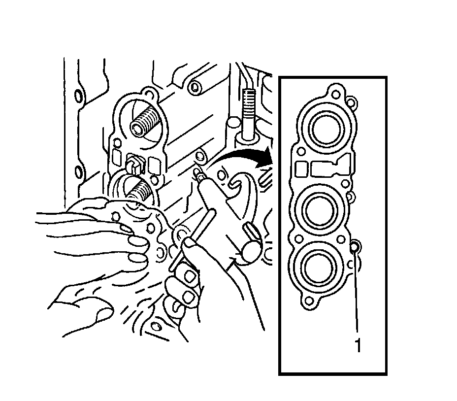 26. Apply 392 kPa (57 psi) of compressed air to the oil hole (1) and remove the direct clutch accumulator piston and spring.