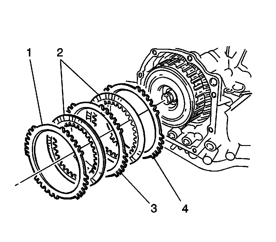47. Remove 2nd coast and O/D brake flange (1), 2 discs (2), and 2 plates (3) from the transaxle case.