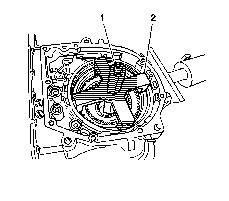 74. Using the DT 46455 (1) and DT 46457 (2), remove the snap ring of 1st and reverse brake.