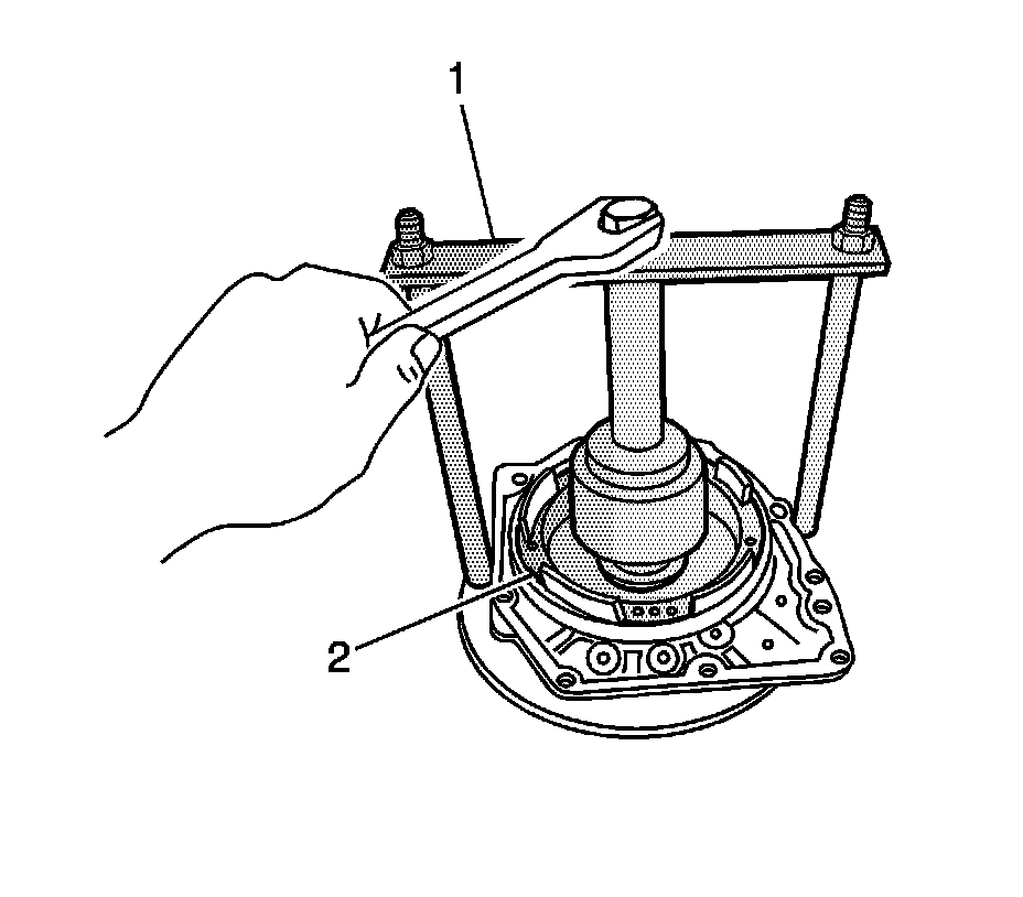 84. Using the DT 46463 (2) and DT 46465 (1), remove the transaxle case side bearing outer race and shim.